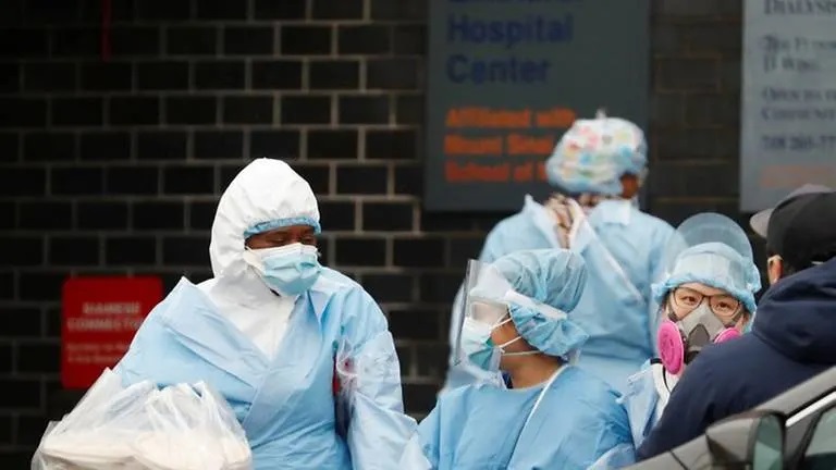 FILE PHOTO: Healthcare workers wearing personal protection equipment (PPE) take a food delivery outside Elmhurst Hospital Center, as the spread of COVID-19 continues, in the Queens borough of New York City.