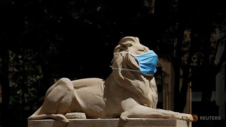 A large mask hangs on the face of a lion statue standing outside of the main branch of the New York Public Library in the Manhattan borough of New York City, US, Jul 1, 2020.