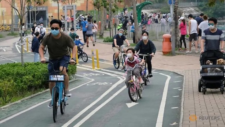 FILE PHOTO: People wearing masks to avoid the spread of COVID-19 ride bicycles at a park in Hong Kong.