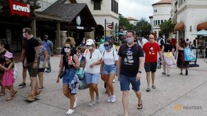 FILE PHOTO: Disney Springs shoppers wear face masks and Disney-themed clothing while Walt Disney World conducts a phased reopening from coronavirus disease (COVID-19) restrictions in Lake Buena Vista, Florida, U.S. July 11, 2020.