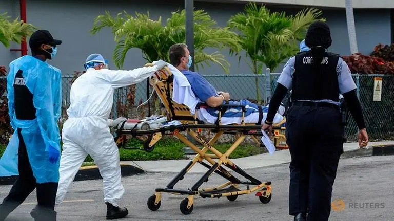FILE PHOTO: Emergency Medical Technicians (EMT) arrive with a correctional patient at North Shore Medical Center where the coronavirus disease (COVID-19) patients are treated, in Miami, Florida, U.S. July 14, 2020.