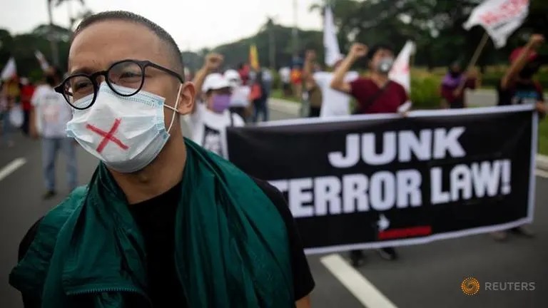 FILE PHOTO: A protester wearing a surgical mask for protection against the coronavirus disease (COVID-19), attends a rally against the anti-terror bill that was approved by President Rodrigo Duterte the day before, in Quezon City, Metro Manila, Philippines, July 4, 2020.