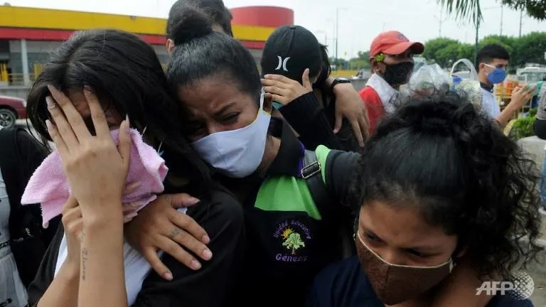 Relatives of a coronavirus victim who died at the start of the pandemic in Ecuador weep as they wait for the recently identified body to be returned to them