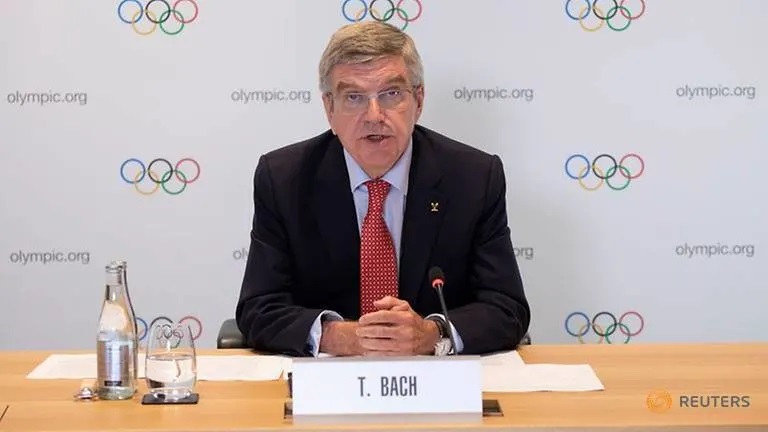 FILE PHOTO: Thomas Bach, President of the International Olympic Committee (IOC) addresses a news conference after a meeting of IOC’s executive board, as the spread of the coronavirus disease (COVID-19) continues, Switzerland July 15, 2020.