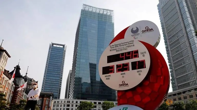 FILE PHOTO: A man wearing a protective mask walks past a countdown clock for the Tokyo 2020 Olympic Games amid the coronavirus disease (COVID-19) outbreak in Tokyo, Japan June 4, 2020.