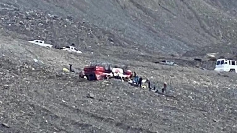 Photos published by media outlets show the upturned red-and-white bus, equipped with monster-truck style tires for crossing ice, on a rocky slope below the road across the glacier’s moraine.