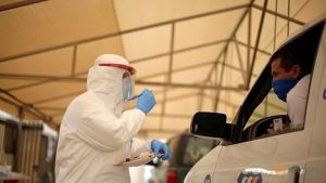 FILE PHOTO: A healthcare worker takes information from a man before collecting a swab sample for COVID-19 at a drive-thru testing site in Ciudad Juarez, Mexico.