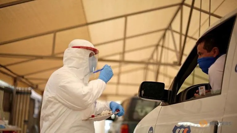 FILE PHOTO: A healthcare worker takes information from a man before collecting a swab sample for COVID-19 at a drive-thru testing site in Ciudad Juarez, Mexico.