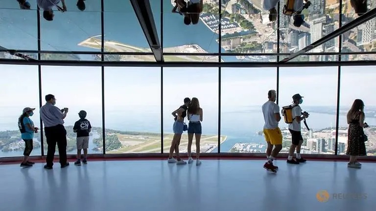 FILE PHOTO: Visitors view panoramic city scenes from the 553 metres (1815 feet) high CN Tower, which reopened for the first time since the coronavirus disease (COVID-19) restrictions were imposed in Toronto, Ontario, Canada July 15, 2020.