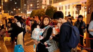 FILE PHOTO: A family and other people from mainland China wait for free shuttle buses to a border gate to Zhuhai in Guangdong province in Macau, China, December 21, 2019.