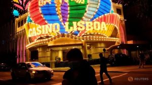 FILE PHOTO: People wearing masks walk in front of Casino Lisboa before its temporary closing following the coronavirus disease (COVID-19) outbreak in Macau, China, February 4, 2020.