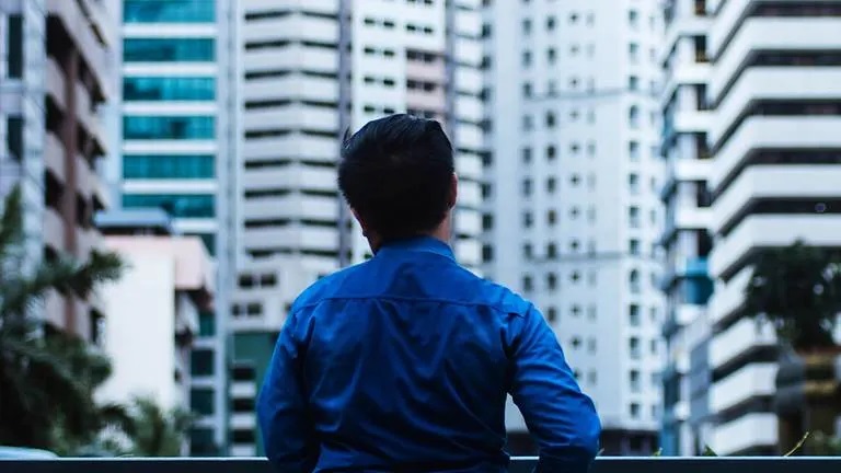 Man standing in front of office buildings.