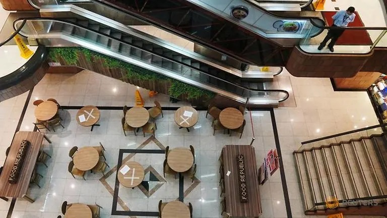 A man wearing a face mask following the coronavirus disease outbreak looks at an empty food court with social distancing markers, at a shopping mall in Hong Kong, China, Jul 20, 2020.