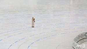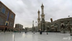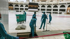 Workers, clutching brooms and disinfectant, were seen cleaning the area around the Kaaba, the structure at the centre of the Grand Mosque draped in gold-embroidered cloth towards which Muslims around the world pray.