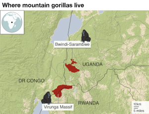 They can be found in Uganda’s Bwindi Impenetrable National Park and a network of parks in the Virunga Massif range of mountains which straddle the borders of the three countries.
