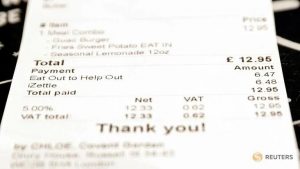 A receipt is pictured at By Chloe restaurant on the opening day of Eat Out to Help Out scheme amid the COVID-19 outbreak in Covent Garden, London on Aug 3, 2020.
