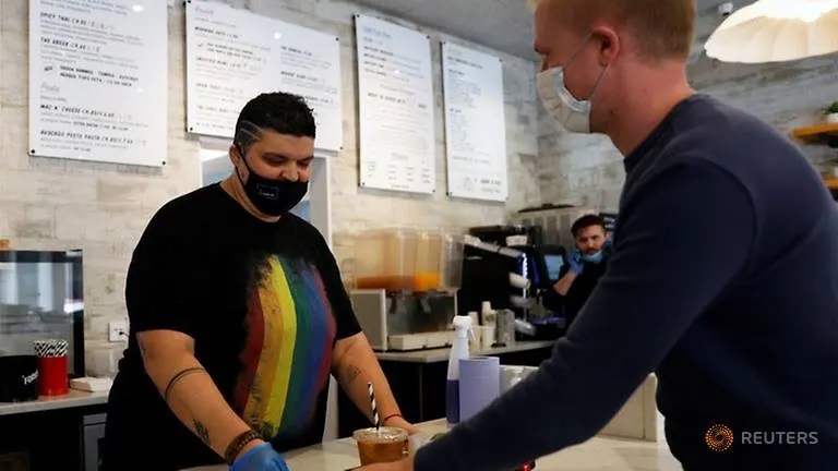 A staff member wearing a protective face mask hands food to a customer at By Chloe restaurant on the opening day of Eat Out to Help Out scheme amid the COVID-19 outbreak in Covent Garden, London on Aug 3, 2020.