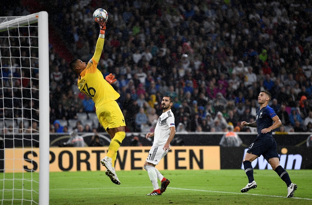 France’s Alphonse Areola and Lucas Hernandez in action with Germany’s Ilkay Gundogan during the Nations League match at the Allianz Arena in Munich September 6, 2018.
