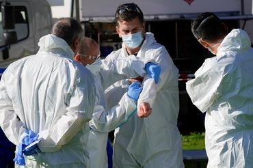 Fire Services Victoria members write each other’s names on their hazmat suits as they prepare to enter a public housing tower, locked down in response to an outbreak of COVID-19, in Melbourne, Australia, Jul 8, 2020.