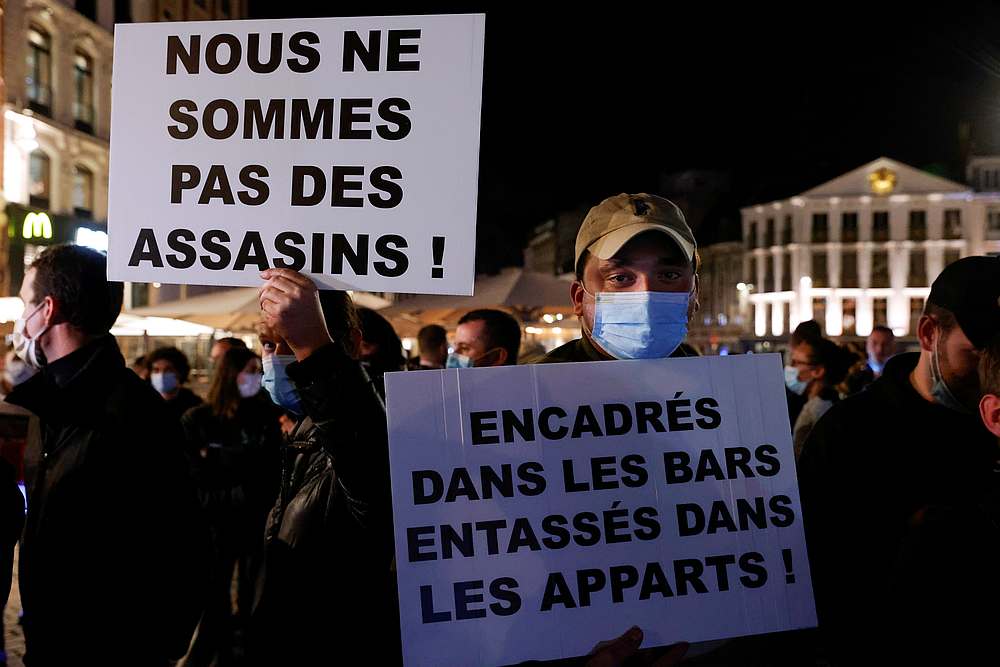 Restaurants and bars owners hold signs to protest against the new sanitary measures to stop the spread of Covid-19 in Lille, France, September 29, 2020. The signs read ‘we are not assassins’ and ‘framed in bars crammed into apartments!’