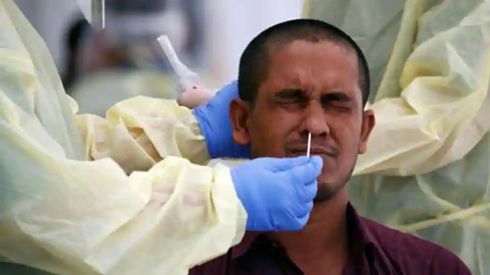 Medical workers perform a nose swab on a migrant worker at a dormitory, amid the coronavirus disease (Covid-19) outbreak in Singapore.