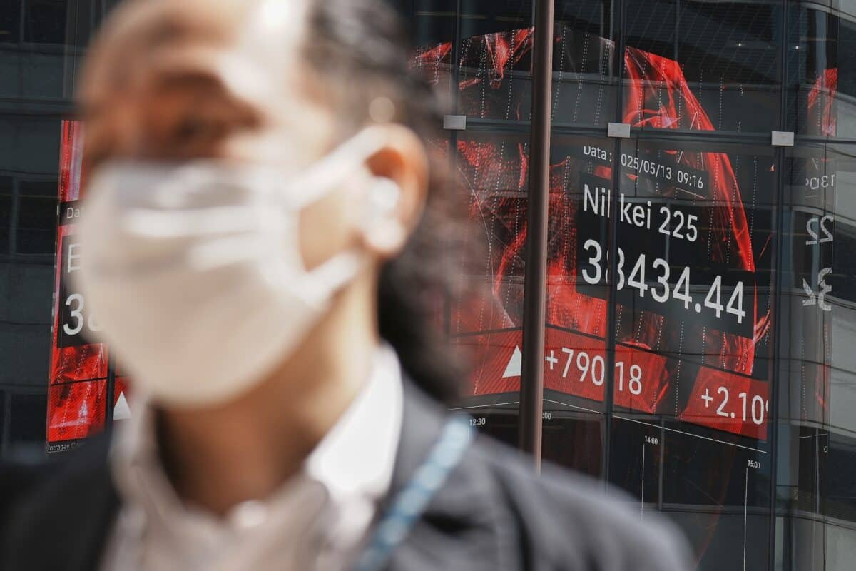 A person walks in front of an electronic stock board showing Japan’s Nikkei index at a securities firm Tuesday, May 13, 2025, in Tokyo
